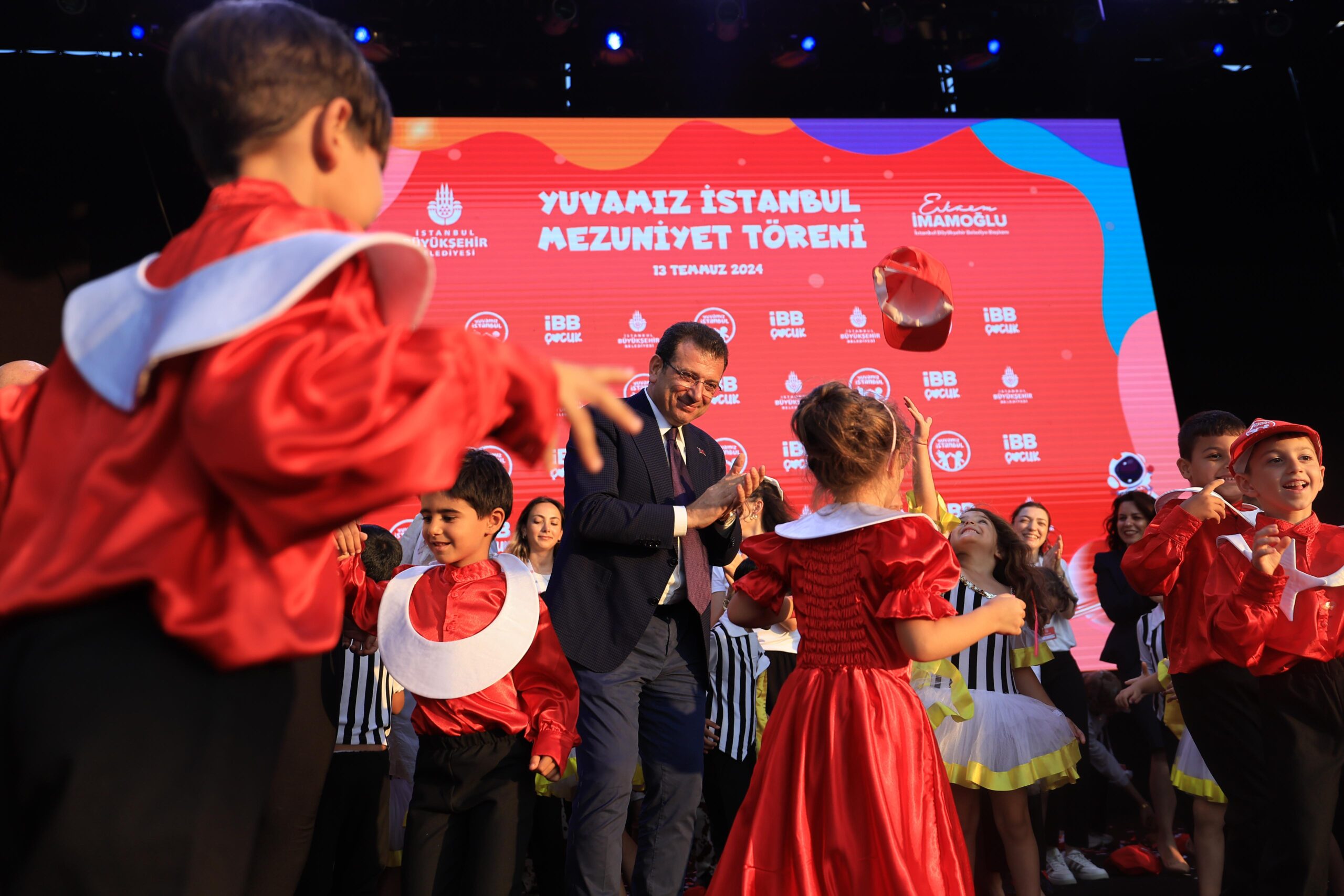 İstanbul Büyükşehir Belediyesi’nin eğitimde fırsat eşitliği ilkesiyle hayata geçirdiği, örnek sosyal projesi Yuvamız İstanbul, 2023-2024 Eğitim döneminin mezunlarını verdi. Okul öncesi eğitimlerini tamamlayan çocuklar için Yenikapı Etkinlik Alanı’nda şenlikli, müzikli; dans ve jonglör gösterili, atölyelerin de yapıldığı mezuniyet töreni düzenlendi. Etkinlikte çocuklarla bir araya gelen İBB Başkanı Ekrem İmamoğlu, mezuniyetlerin klasikleşen seremonisi yaparak çocuklarla şapka fırlattı.